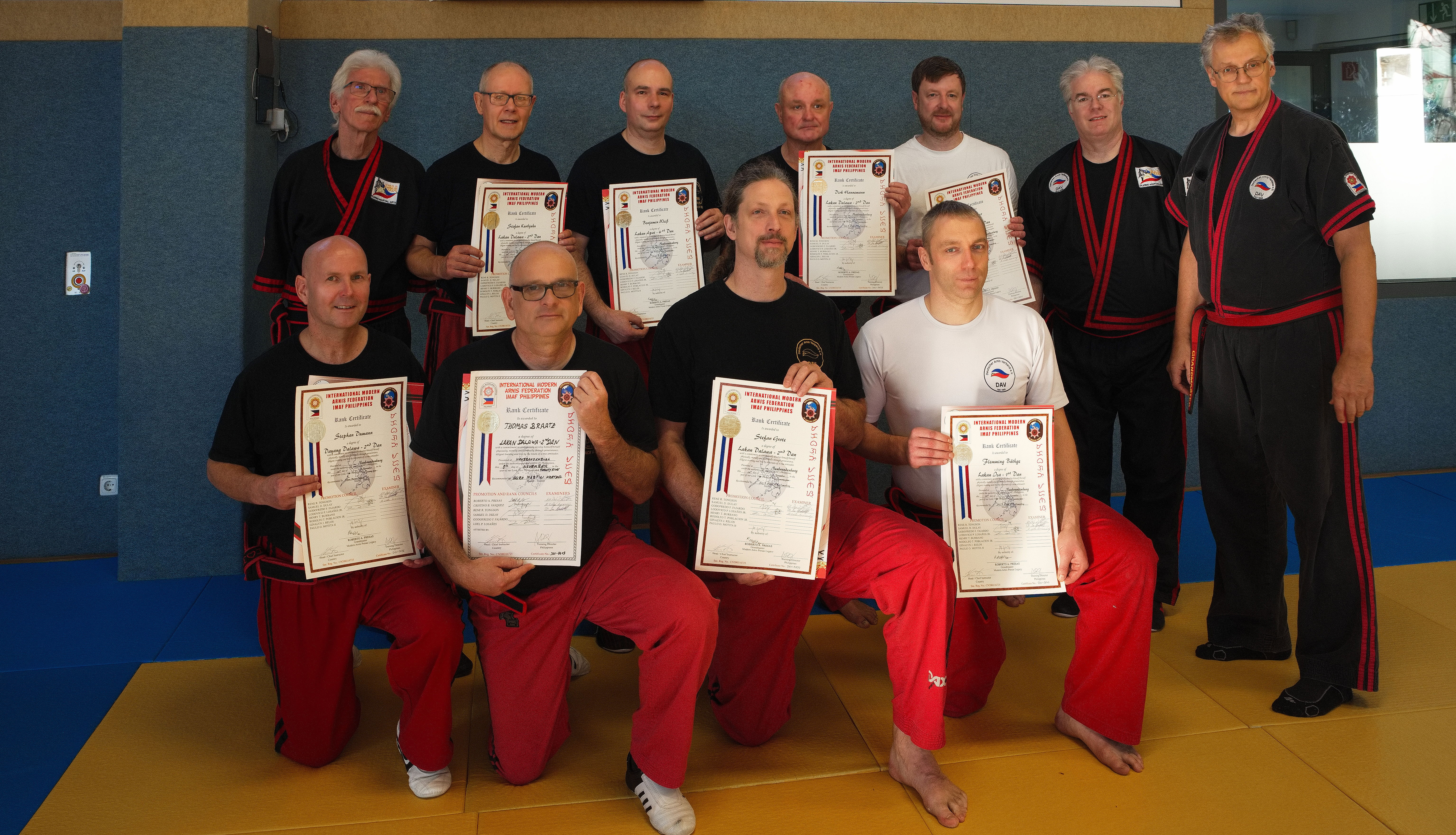 Insgesamt 8 Prüflinge stellte sich der Prüfungskommission bestehend aus dem Bundestrainer Datu Dieter Knüttel (10.Dan), dem 1. Vorsitzenden des DAV Sven Barchfeld (7.Dan), sowie dem dritten Dan Prüfer Klaus-Dieter Armerding (6.Dan). Am Ende einer sehr gelungenen Prüfung – so waren sich die drei Prüfer einig – standen 2 neue Lakan Isa, 5 neue Lakan Dalawa und ein neuer Lakan Apat.